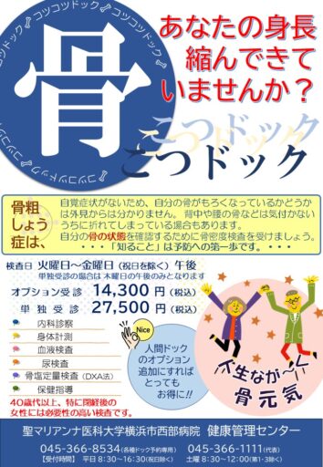 皆さんは「骨の健康」について考えたことはありますか?骨粗しょう症は骨の強度が低下し、わずかな外力で骨折を生じる病気です。一度骨折をすると運動や生活が著しく制限され、介護の負担も増加します。また、余命が短くなるとの報告もあります。骨粗しょう症による骨折の予防には、日頃から検診などにより骨折の危険性を評価しておくことが重要です。自分の骨の状態を確認するために、骨こつドックを受けてみませんか?