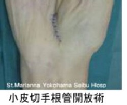 手首で正中神経が圧迫されることで発症します。中年女性や妊産婦、手を酷使する重労働者に多くみられます。症状は人差し指、中指のしびれや痛みで、時として親指、薬指にも症状が及びます。夜間・明け方に増悪しやすく、手をふることで軽減することがあります。進行すると親指の付け根の筋肉(母指球筋)が痩せてきて、物をつまむ動作がしにくくなります。単純レントゲン検査、知覚検査、超音波検査、神経伝導速度などの検査を行ない診断しております。症状の軽度な方や母指球筋の萎縮が強くない方は手関節装具の着用、ステロイド注射による保存療法をします。保存療法で改善ない方や筋萎縮が高度な場合は手術療法を検討します。手術は局所麻酔で行なう小皮切手根管開放術を基本としております。日帰りまたは1泊入院で手術可能です。抜糸まで1週間前後は傷の保護が必要ですが、日常動作はすることが可能です。重労働といった手の負担は術後1~2カ月は避けてもらいます。