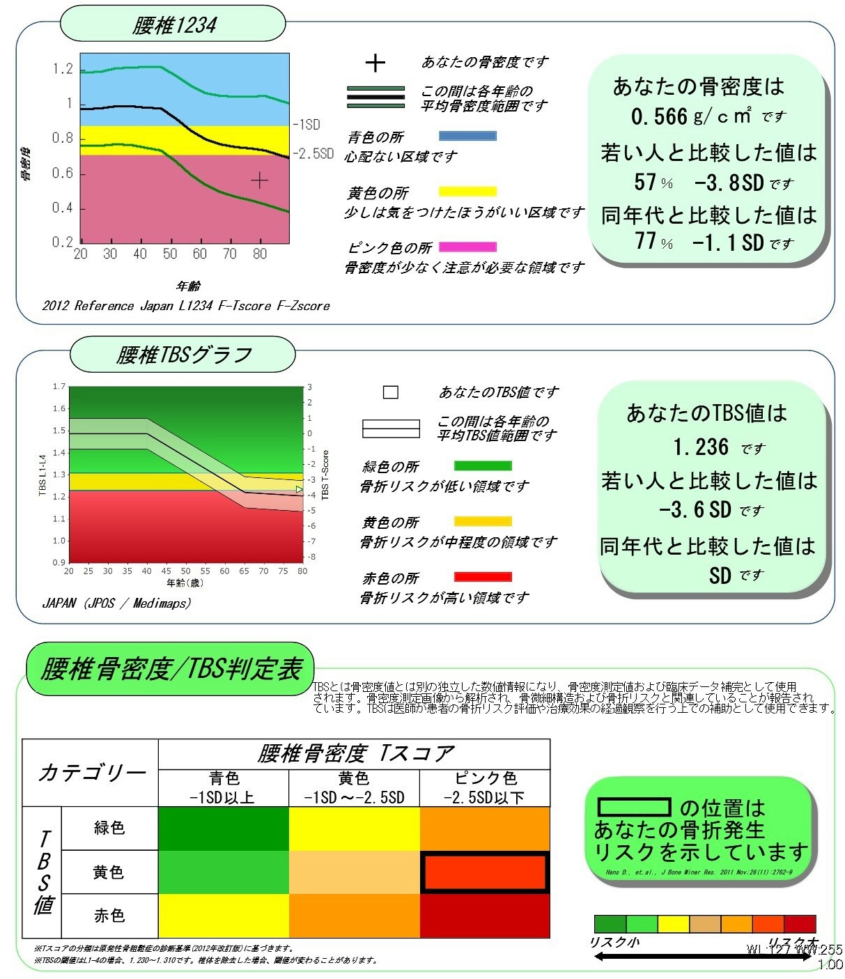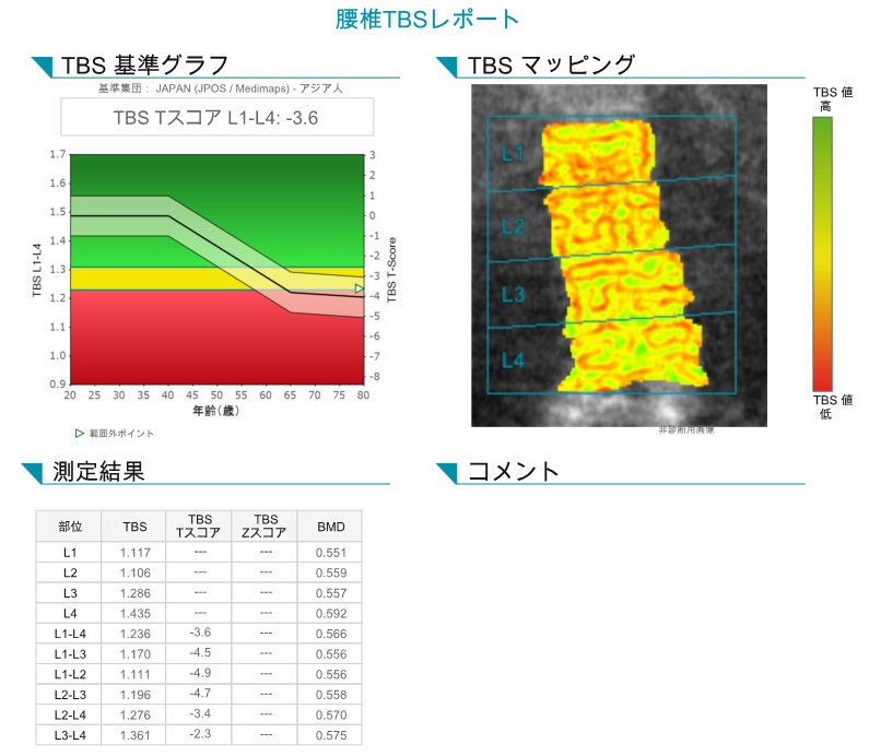 骨塩定量検査では骨密度だけではなく骨質(海綿構造指標:TBS)の評価が可能になりました。骨密度が同じなのに、なぜか骨が折れやすい人がいます。骨強度は骨密度と骨質によって説明されますが、これまで骨密度が高い方に起きる脆弱性骨折の評価は難しいものでした。TBSを組み合わせることで骨密度と骨質の両方から評価することでより正確な骨粗しょう症診断が可能です。