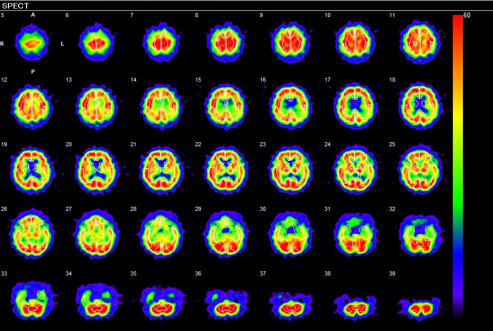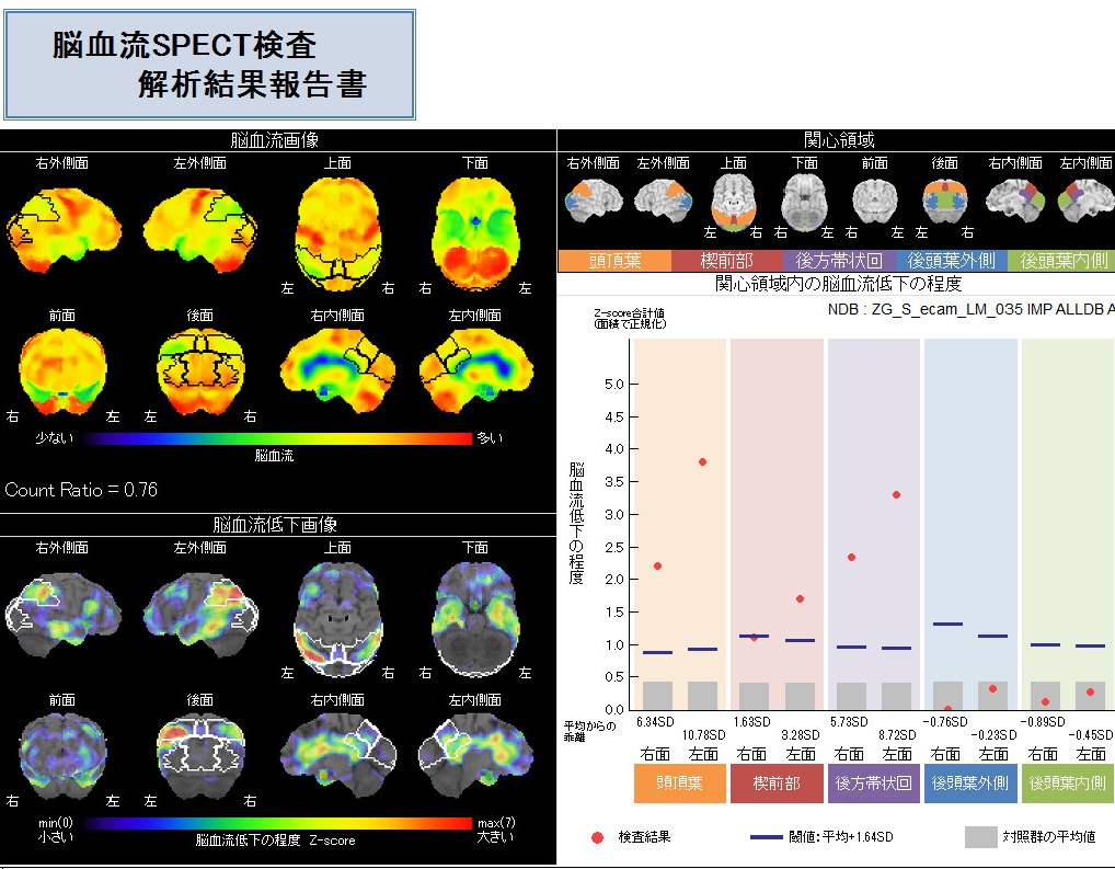 核医学では認知症診療の一つとして脳血流SPECTを施行しています。脳血流SPECTでは脳血流が低下している部位を調べることにより認知症の早期診断や4大原因であるアルツハイマー型認知症やレビー小体型認知症、血管性認知症、レビー小体型認知症、前頭側頭型認知症などを鑑別することが可能です。 かかりつけ医や認知症サポート医の皆様の認知症治療やケアに有意義となる画像を提供しています。