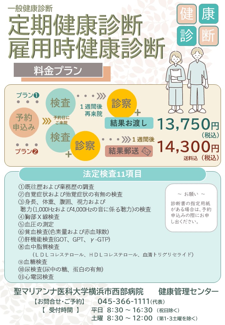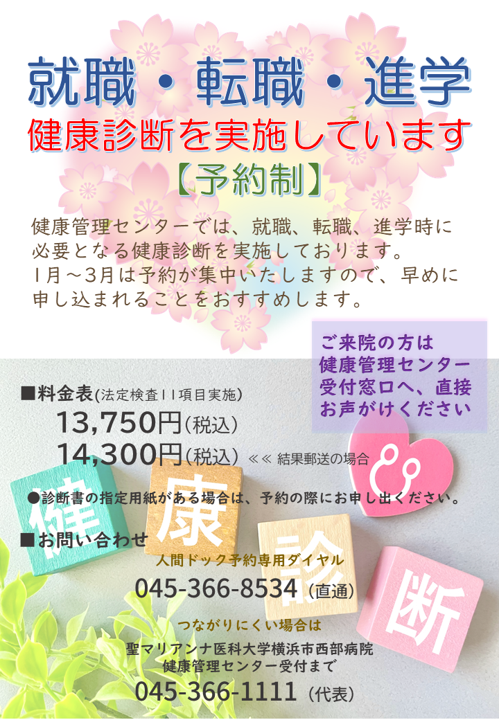 健康管理センターでは、新しい職場に入職される際に必要となる健康診断(雇入時健康診断)を実施しております。予約制となりますので、早めに申し込まれることをおすすめします。