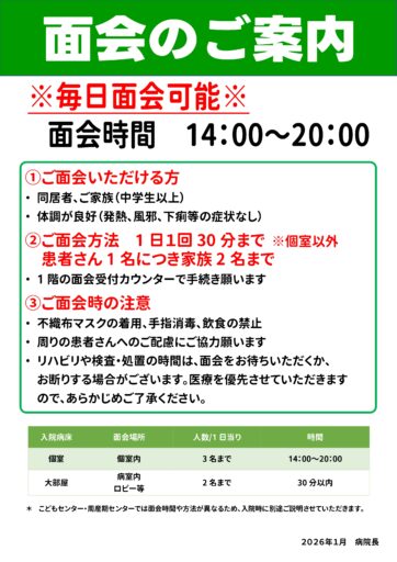- 1日1回30分まで、患者さん1人につき家族2名まで ※個室除く