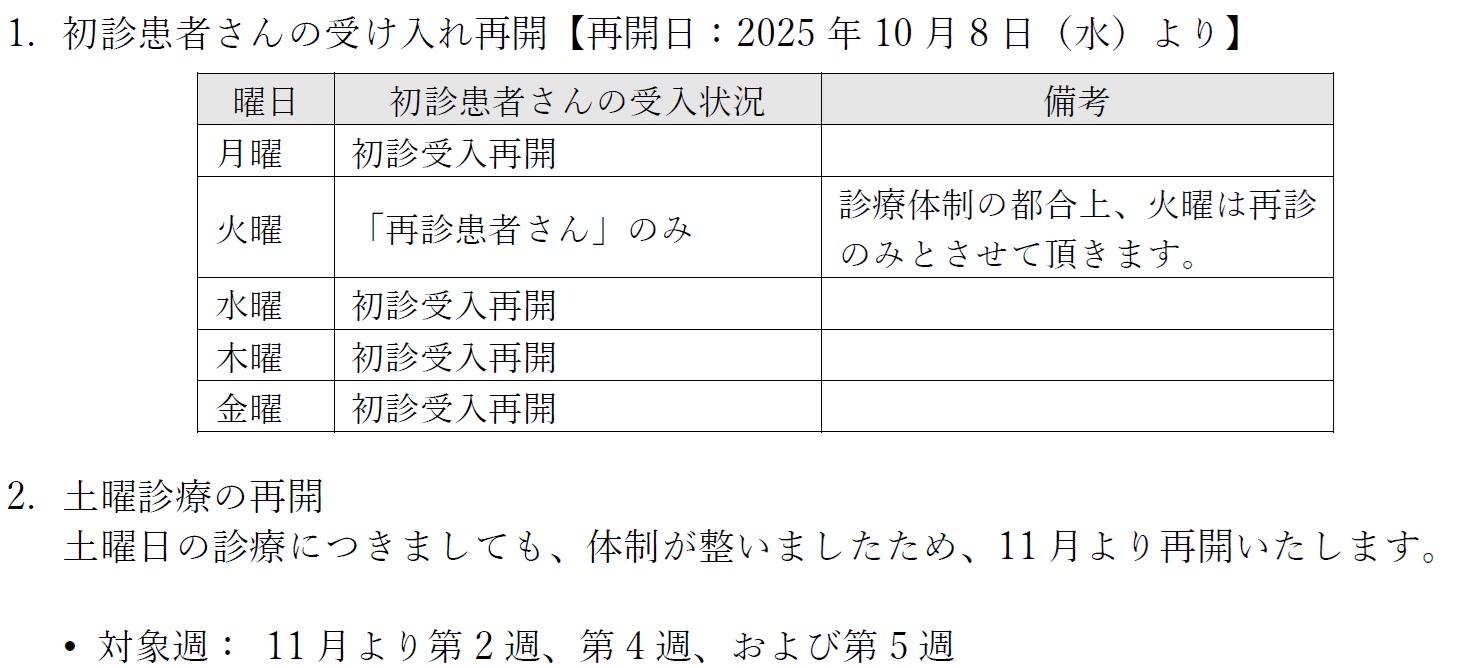 さて、先に(2025年8月19日付)お知らせいたしました、当院皮膚科における初診患者さんの受け入れ一時中止につきましては、