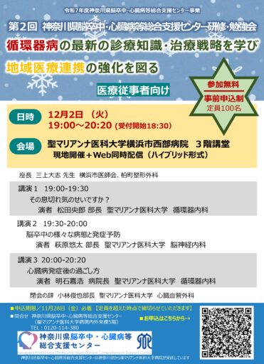 医療従事者の方々を対象とした「第2回 神奈川県脳卒中・心臓病等総合支援センター研修・勉強会」を開催いたします。