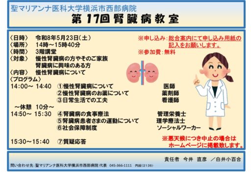 2026年度第1回(通算第17回)腎臓病教室を開催いたします。 慢性腎臓病の患者さんやご家族を中心に、どなたでもご参加可能です。皆さまのご参加をお待ちしております。