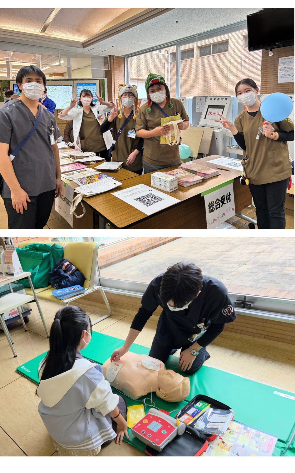 研修医は消化器・一般外科の先生と一緒に「フューチャードクタースクール」で腹腔鏡手術や縫合の体験コーナーを担当。また、横浜消防と連携し、参加者にAED操作や心肺蘇生の指導も行いました。