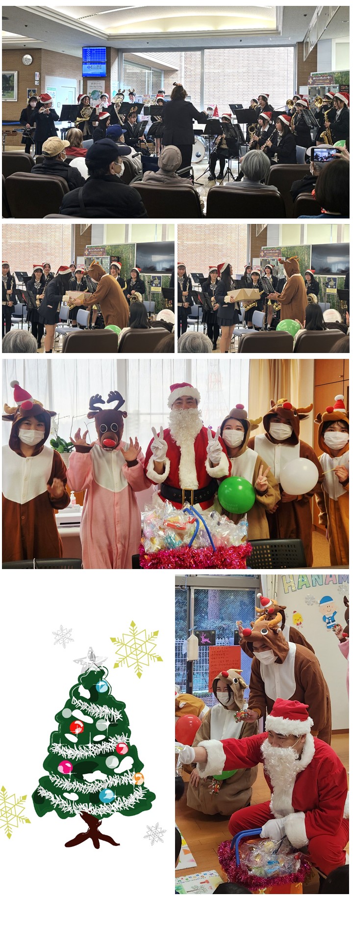 12月23日、クリスマス行事が行われ、明石病院長がサンタに扮し、例年通り、研修医のトナカイ、小児科 長江先生ともに院内を訪問しました。また、エントランスホールでは横浜瀬谷高校 吹奏楽部によるクリスマスコンサートも開催され、華やかなクリスマスイベントとなりました。