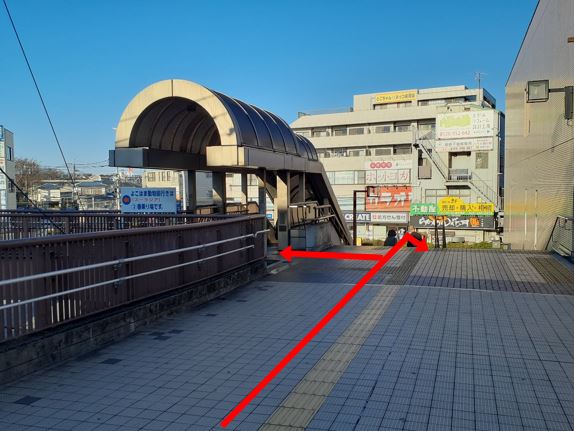 3.三ツ境駅を出て歩道を直進し、前方の階段を下りてください。(バスをご利用の方は左へ)