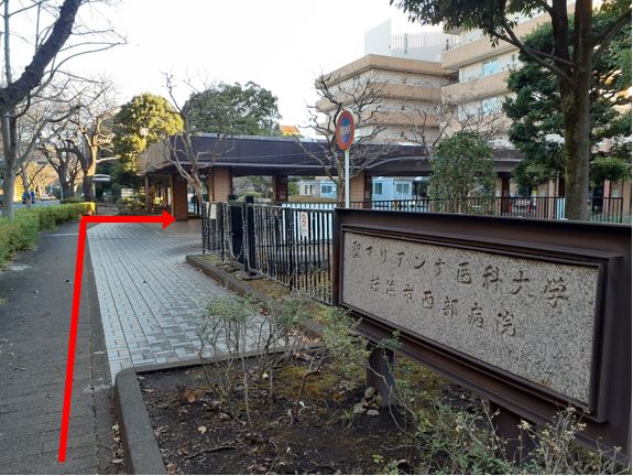 7.中原街道の「西部病院入口」交差点を紅白のアンテナ塔(水道企業団)側に横断し、野境道路をさらに直進してください。(左手に当院の看板もございます)